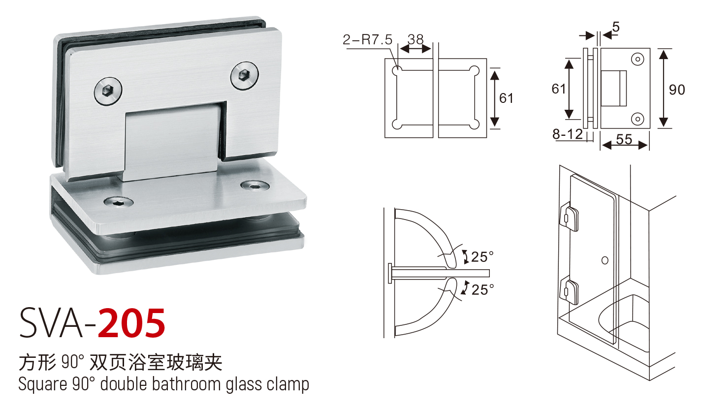 SVA - 205 方形 90° 双页浴室玻璃夹
