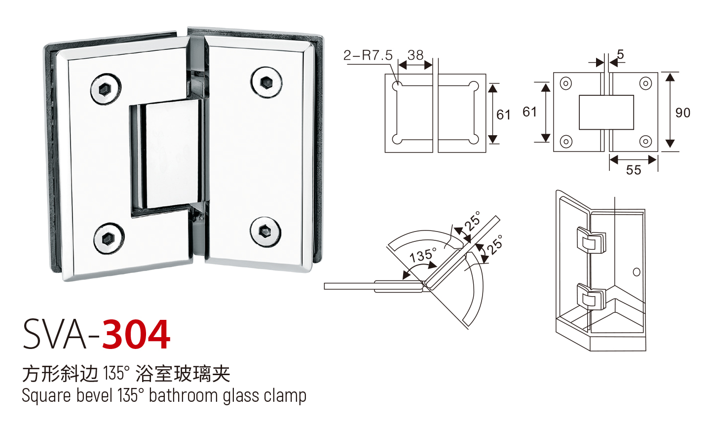SVA - 304 方形斜边 135° 浴室玻璃夹