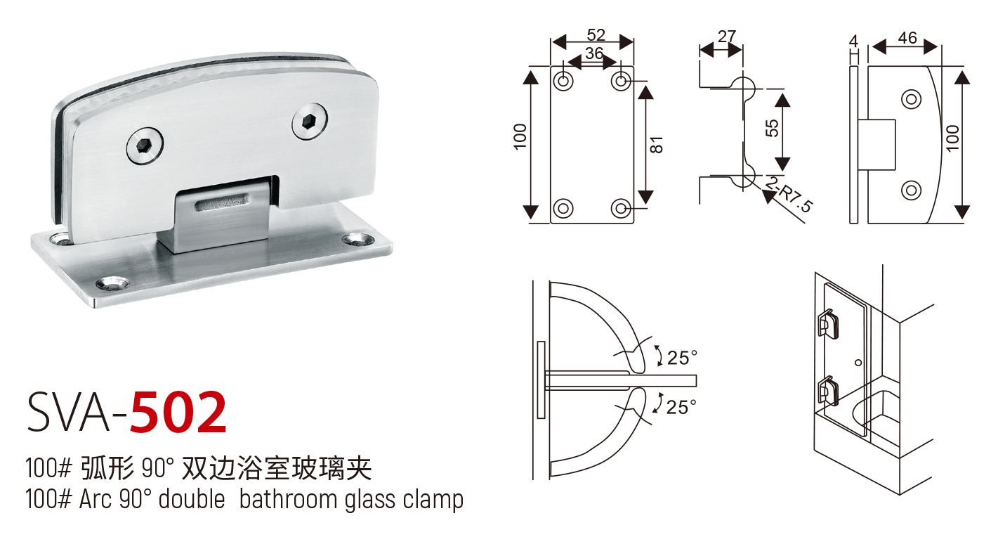 SVA - 502 100# 弧形 90° 双边浴室玻璃夹