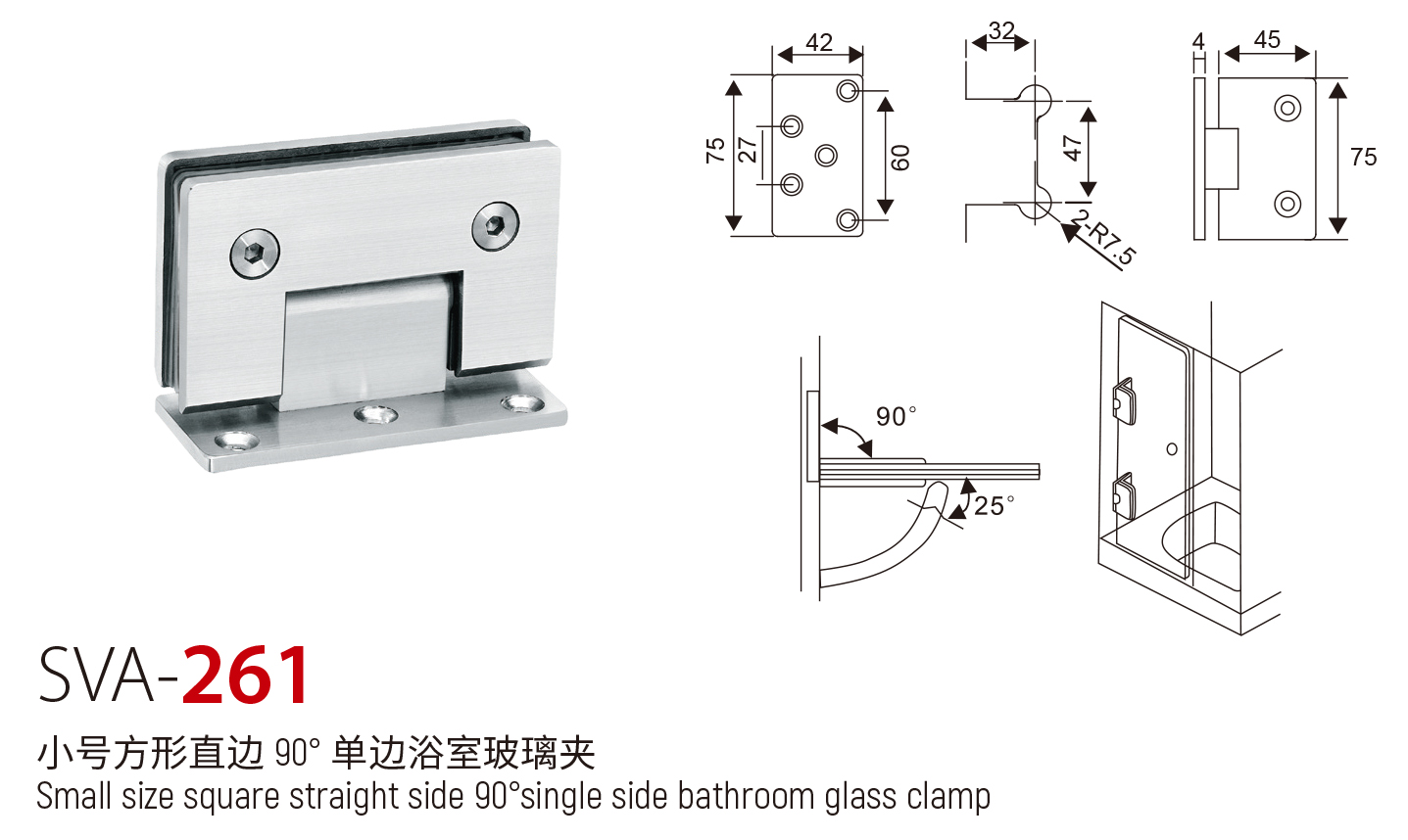 SVA - 261 小号方形直边 90° 单边浴室玻璃夹