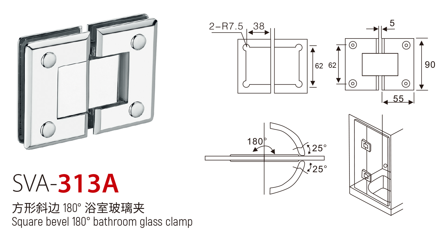 SVA - 313A 方形斜边 180° 浴室玻璃夹