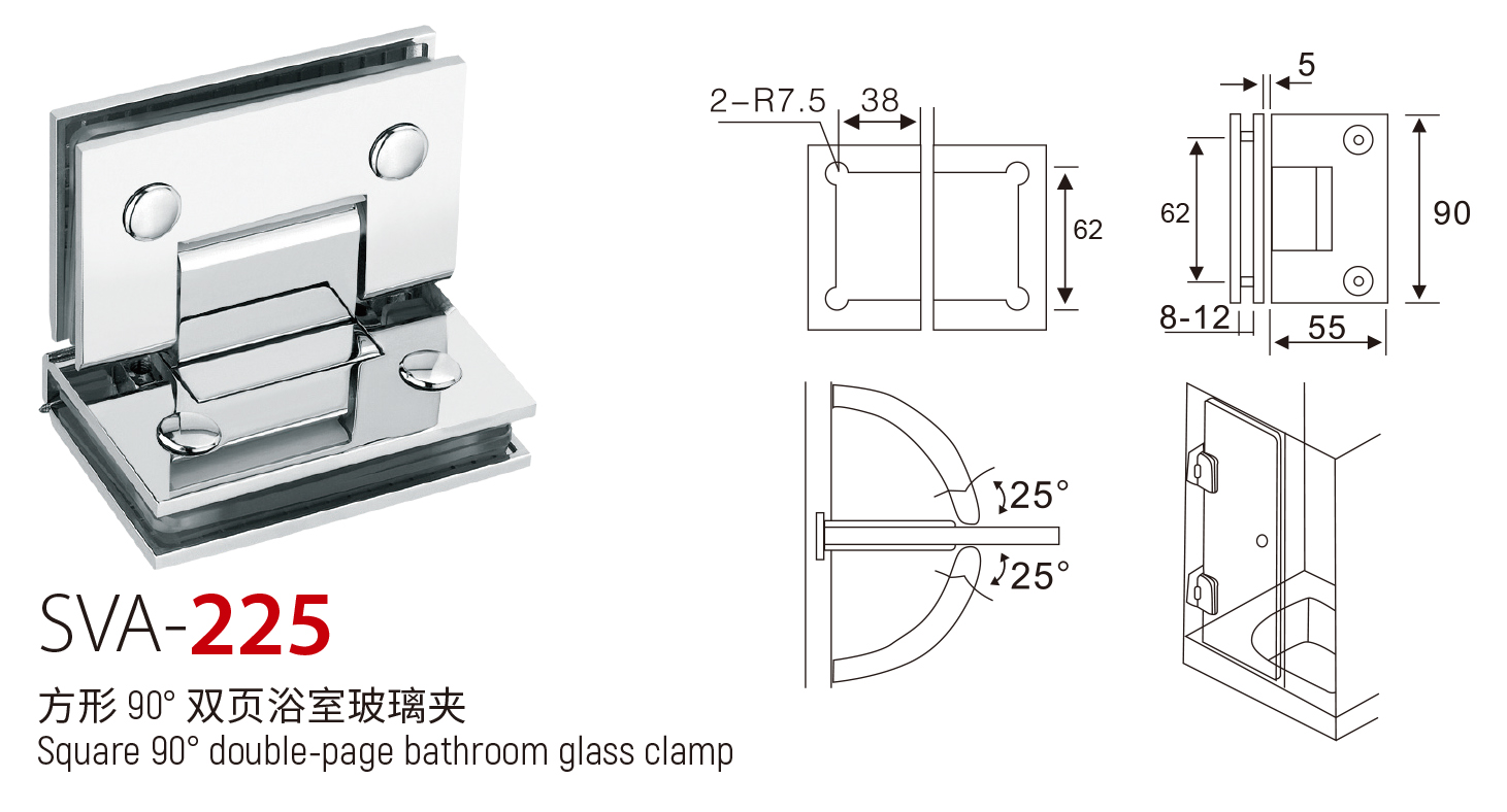 SVA - 225 方形 90° 双页浴室玻璃夹