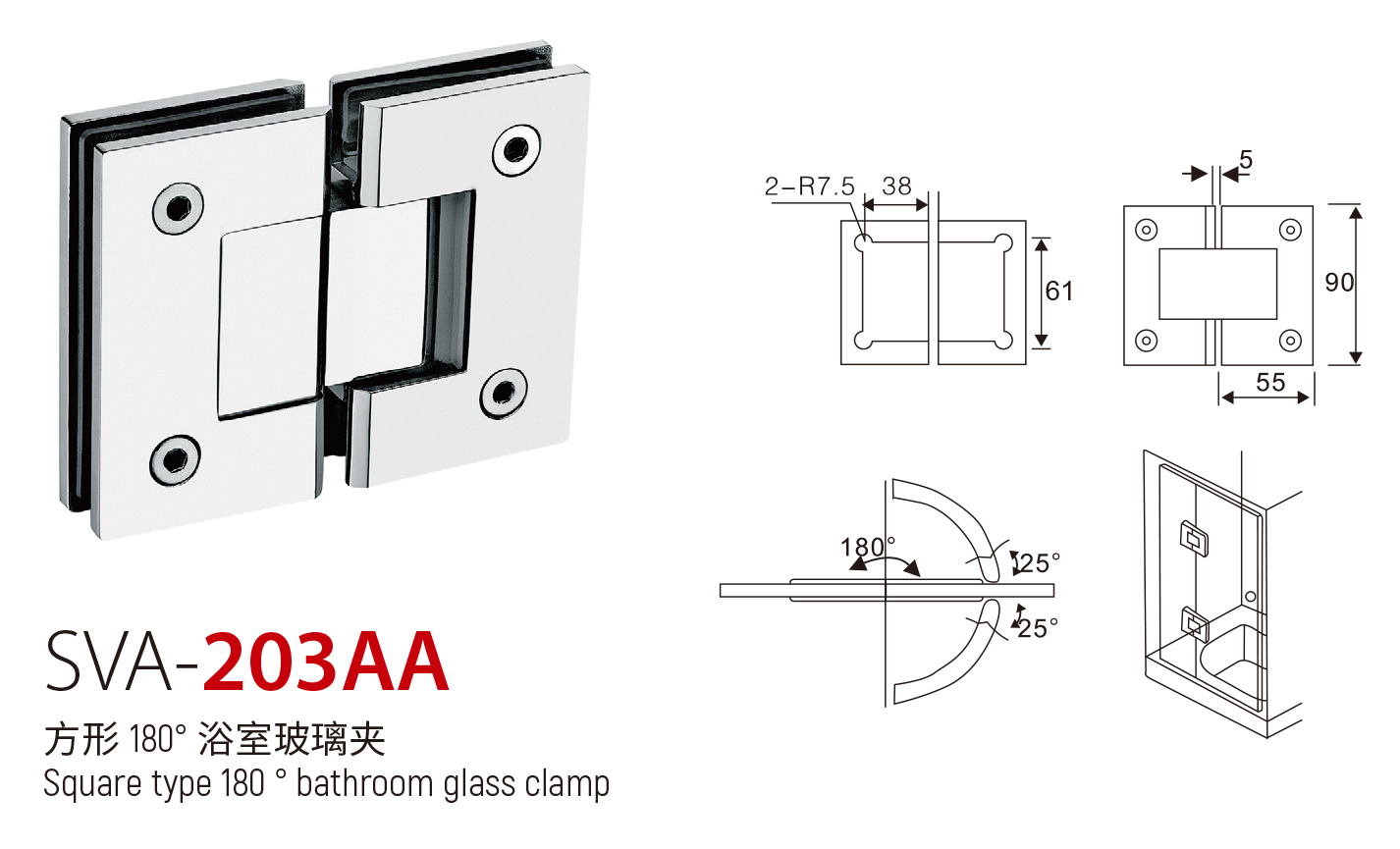 SVA - 203AA 方形 180° 浴室玻璃夹